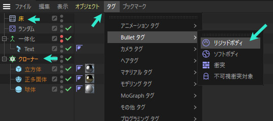 - [Bulletタグ]から[リジットボディ Rigid Body(剛体)]を選択。※C4Dで自動的に上下を判定して、床には[衝突 Collider Object]タグが追加される。