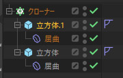 - ひとつめの立方体の屈曲デフォーマの[強度]を「0°」に。もう一方の立方体の屈曲デフォーマを[180°]とする。二つのクローンが反復される。